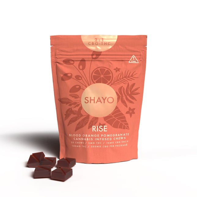 Set your intention for the day with Shayo Rise. Bright citrus and tart pomegranate intertwine giving you a complex flavor that is grounded and strikes a remarkable balance. Rise showcases a unique 1:2 ratio of THC:CBG. CBG is known as the "Mother cannabinoid” and might help to regulate your body’s intake and reaction to THC, ensuring everything is flowing in harmony.